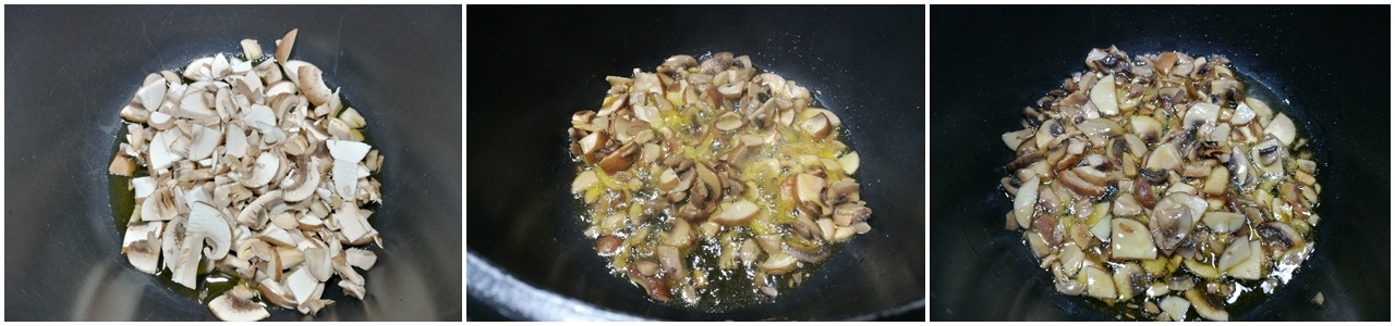 Picamos la cebolleta lo más fina que podamos y la sudamos en la grasa que tenemos reservada para preparar el roux. Añadimos a continuación los champiñones troceados en trozos no muy grandes y dejamos que se cocinen bien y cojan un poco de color.