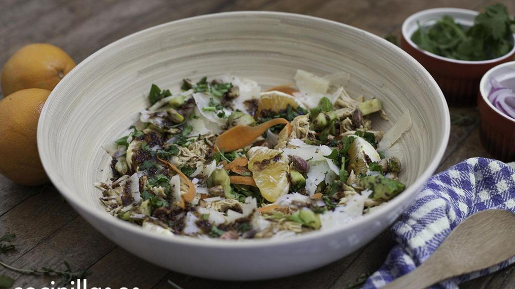 Las pechugas de pollo pueden resultar un poco insípidas, pero eso no es inconveniente, al contrario, puede ser toda una ventaja que permite combinar esta carne casi con cualquier otro ingrediente sin miedo al resultado. Como en esta ensalada de pollo con naranja. Ya os adelanto que los cítricos le van genial al pollo.