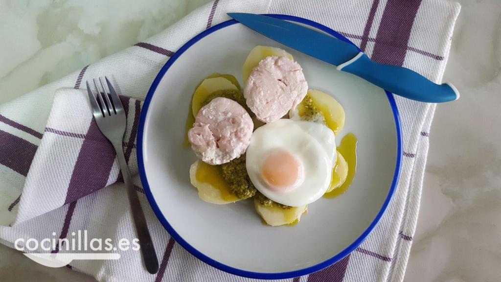 Ensalada templada de patata, pollo y pesto, receta rápida de aprovechamiento
