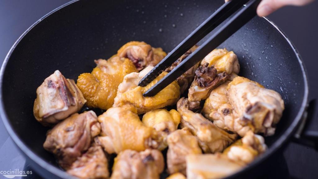 En el mismo aceite, agregamos el pollo que teníamos reservado. Mantenemos el fuego o la potencia a intensidad media. Doramos la carne por un lado. Cuando veamos el color amarillo, damos la vuelta y doramos la otra parte. Reservamos y guardamos una parte del aceite empleado. Nosotros hemos retirado la mitad, para que el acabado del plato no sean tan aceitoso. Si os gusta con abundante aceite, dejad la cantidad original y pasad al siguiente paso.