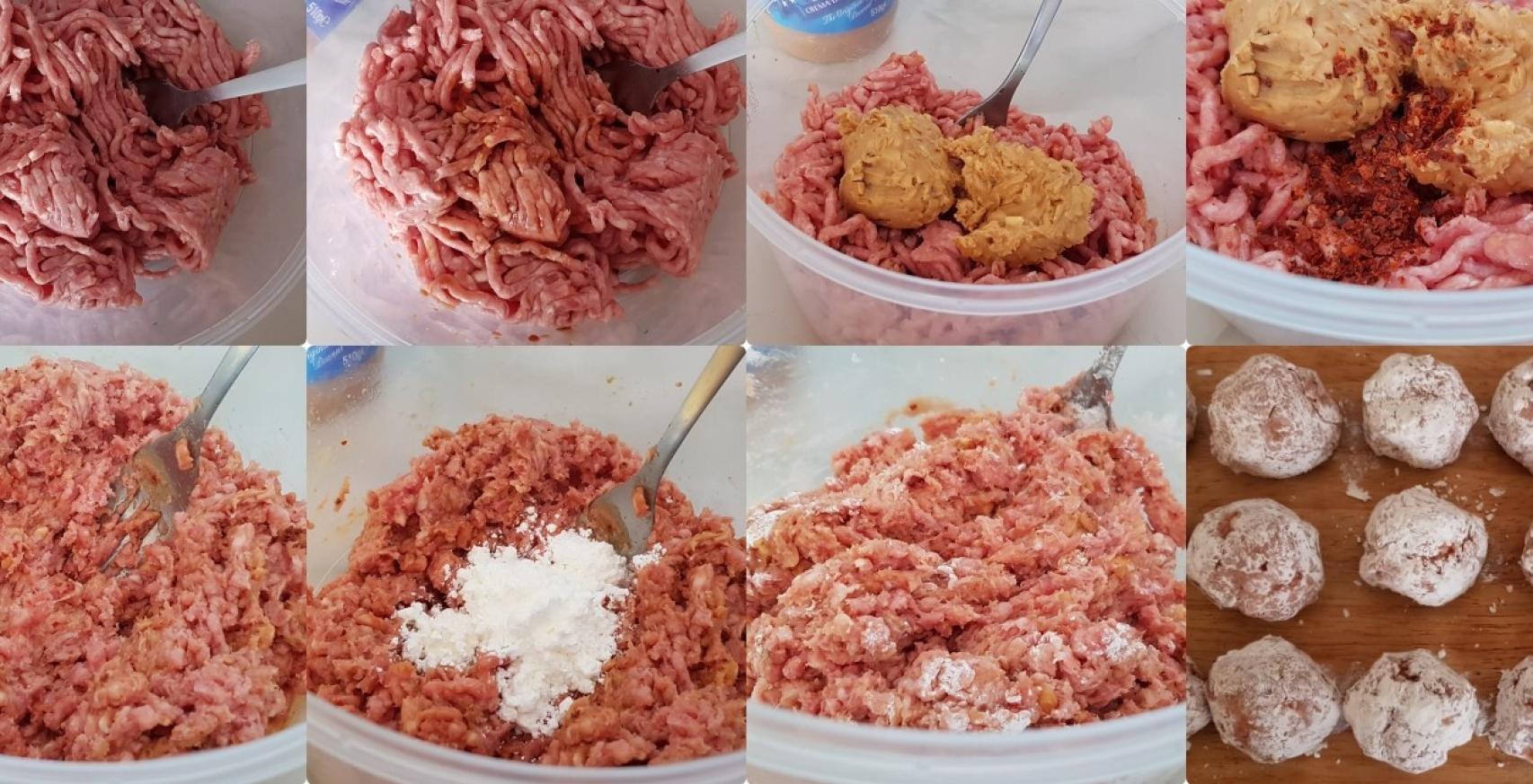 En un bol amplio ponemos la carne picada y añadimos el aceite de oliva o la mantequilla de cacahuete, la salsa de soja, el aceite de sésamo,  y los copos de chile, si queremos que tengan un toque chispeante. Mezclamos bien, añadimos la fécula de maíz, mezclamos, amasamos, damos forma a las albóndigas y las rebozamos en un poco más de fécula de maíz.