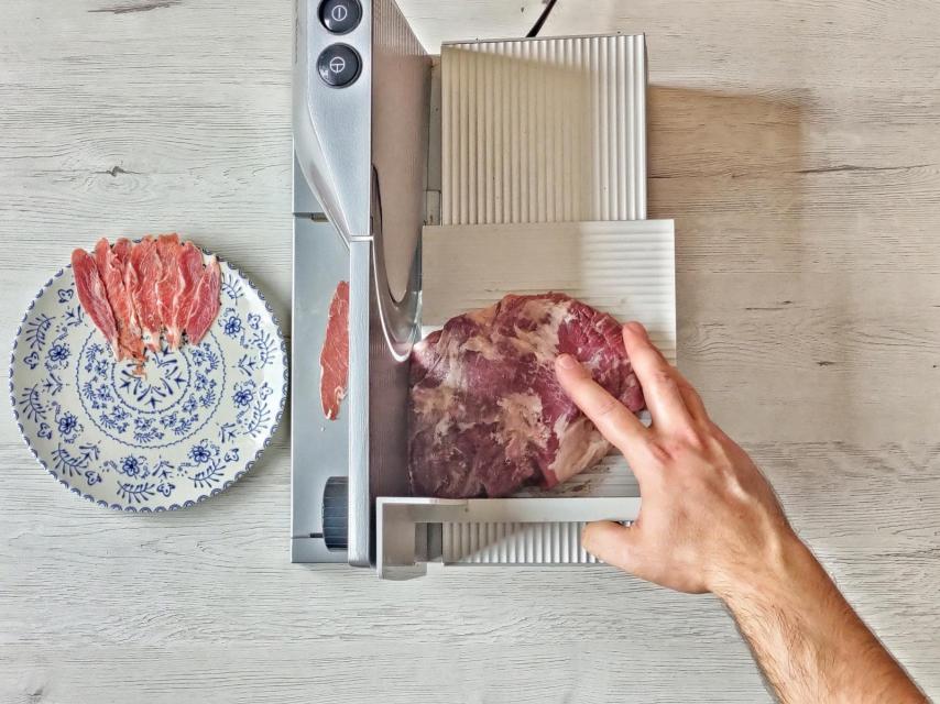 Es muy importante contar con una presa ibérica de la mejor calidad y tenerla congelada durante al menos 3 días para que esté muy, muy dura. Lo óptimo es que haya sido ultracongelada para que no pierda propiedades. Con la ayuda de una máquina corta fiambres lonchear la presa muy, muy fina, es importante que esté congelada para que el corte sea fácil y regular. Disponer cada loncha sobre un plato amplio, de manera que se superpongan ligeramente pero no mucho.