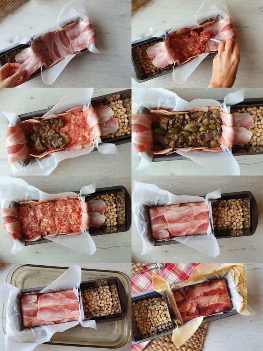 Disponer el bacon en el molde, poner encima la carne, en medio las setas y los alcaparrones y terminar con más carne. Hornear.