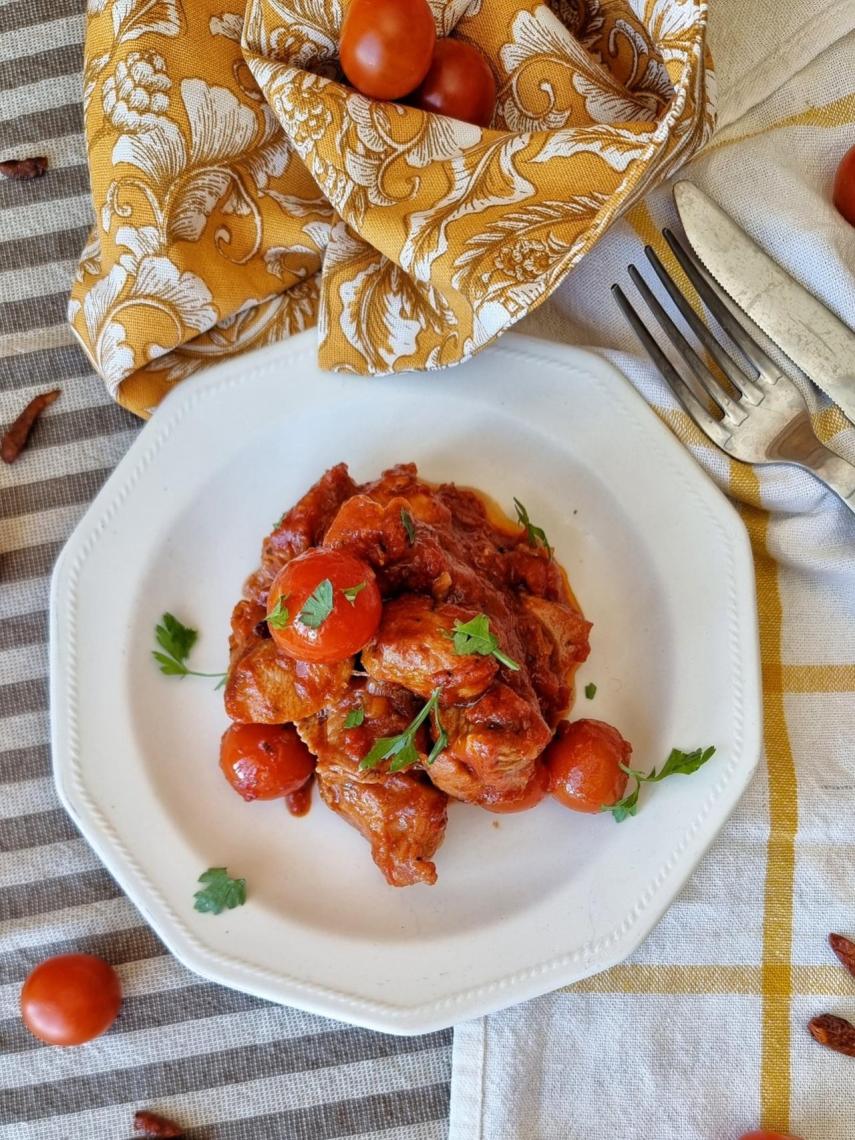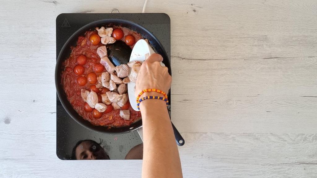 Guiso de pavo picante con tomate, receta italiana "all'arrabbiata"