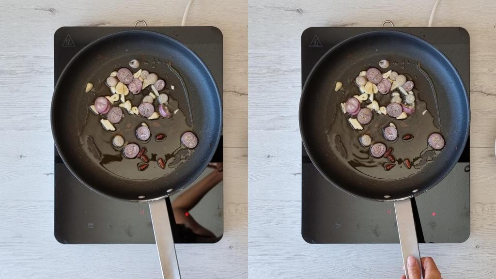 En esa misma sartén, añadir un poco más de aceite y dorar los dientes de ajo pelados y fileteados con las cayenas. Cuando empiecen a tomar color incorporar también las chalotas peladas y también loncheadas finamente en rodajas. Dorar ligeramente todo, con cuidado de que no se queme porque es algo que pasa muy rápido y, con el ajo, amarga muchísimo.