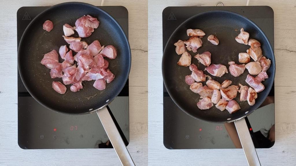 Trocear el pavo con la ayuda de un cuchillo y salpimentar. Tendremos que conseguir trozos de bocado, pero no muy pequeños para que no se queden muy secos y pasados. Saltear el pavo en una sartén a fuego muy fuerte con un poco de aceite, para que se doren completamente por todas partes. Reservar.