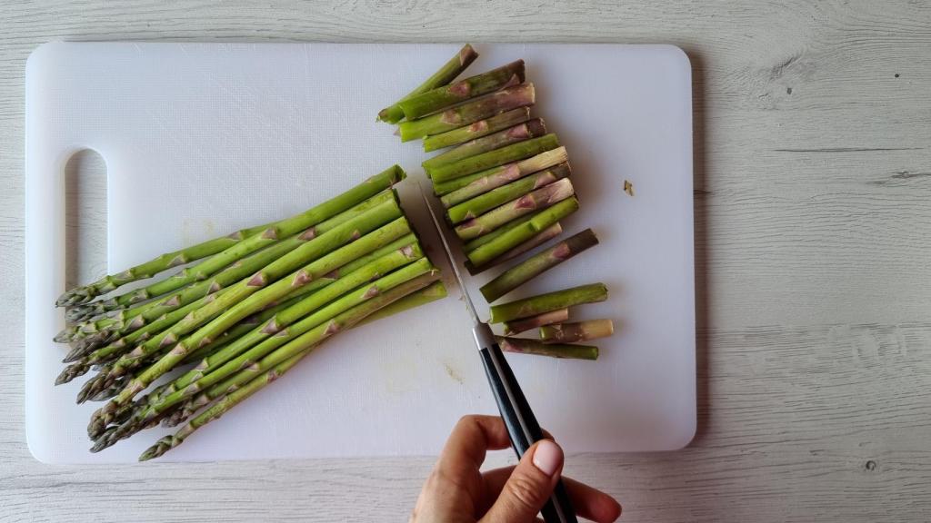 Mientras tanto, quitar la parte del tallo de los espárragos y desecharla. Trocear los espárragos y lavar bien los tomates cherry.