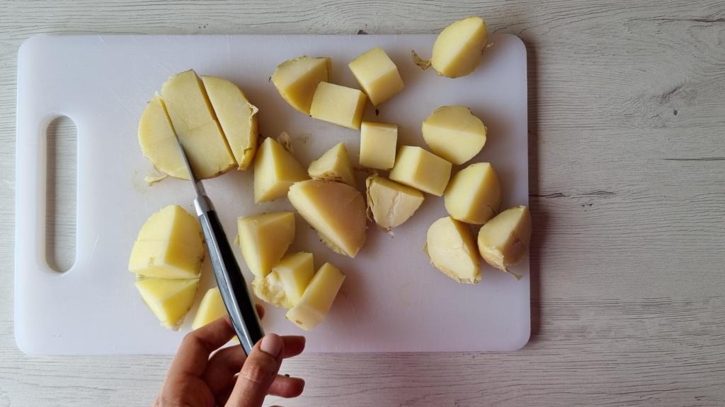 Cocer las patatas en un cazo con abundante agua hirviendo, o en el microondas, hasta que al pincharlas con un tenedor estén tiernas pero que la piel no empiece a desprenderse de la carne de la patata. Con cocerlas 12 minutos tendría que ser suficiente. Dejar enfriar ligeramente, pelar y trocear.