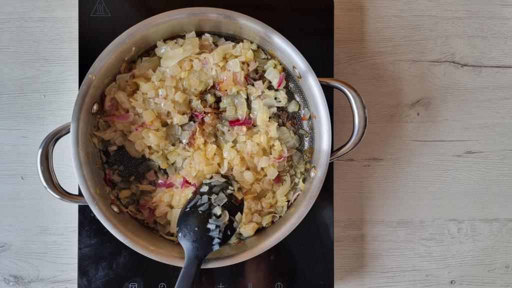 Pelar la cebolla y picarla finamente. Hacer lo mismo con el diente de ajo. Disponer ambas cosas en una sartén honda y pochar a fuego suave con aceite de oliva y sal. Remover de vez en cuando hasta conseguir un tono transparente y amarillento en la cebolla.