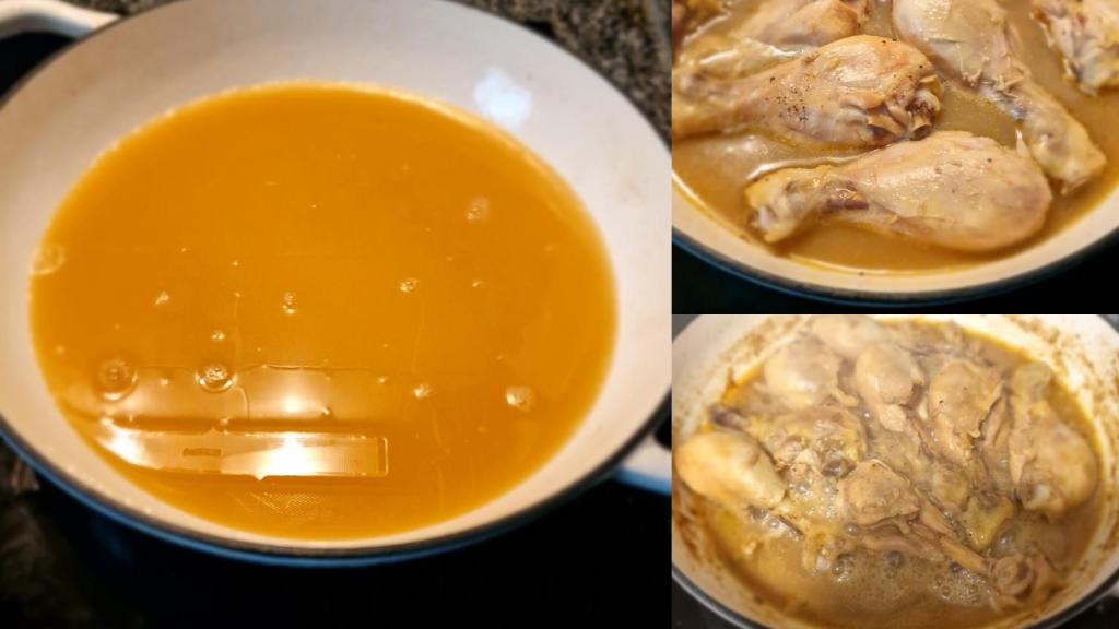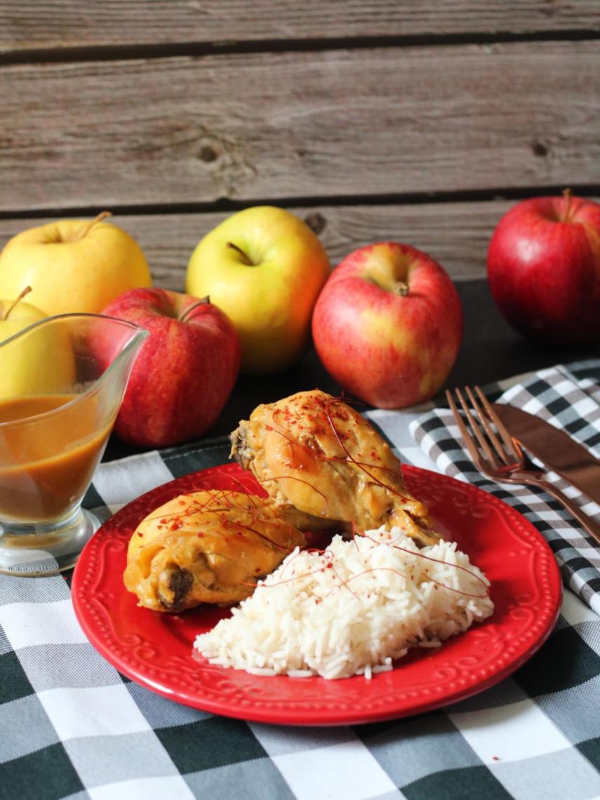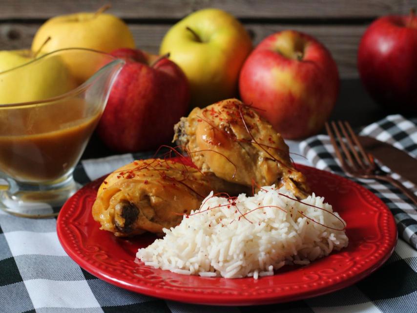 Solo necesitas dos ingredientes, pollo -previamente sazonado con sal y pimienta- y manzanas. Ni aceite, ni mantequilla, ni nada, ni harinas que espesen la salsa. Durante la cocción, los azúcares presentes de forma natural en la manzana se van caramelizando para aportar un bonito color dorado, y tanto el colágeno del pollo como la pectina de la manzana -un gelificante natural- obran su magia para dar lugar a una salsa de textura densa y untuosa.