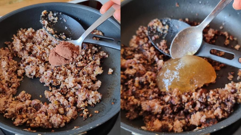 Incorporar el cacao y mezclar bien. Tras esto, añadir el caldo suficiente para que quede una salsa ligera. Cocinar un par de minutos para que haga ese chup chup y condense bien. Poner a punto de sal y de pimienta negra.