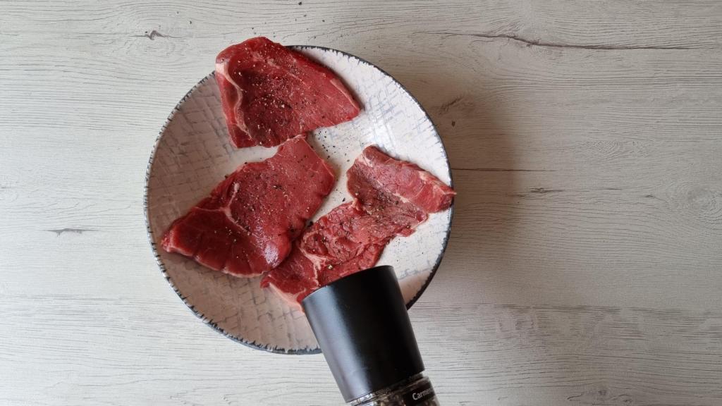 Pedir al carnicero filetes de tapilla, de unos 5 milímetros de grosor, de tamaño pequeño, cortados un par de veces para que los filetes no sean muy grandes dentro de la cazuela y puedan bailar bien con la salsa. Añadir sal y pimienta a los filetes.