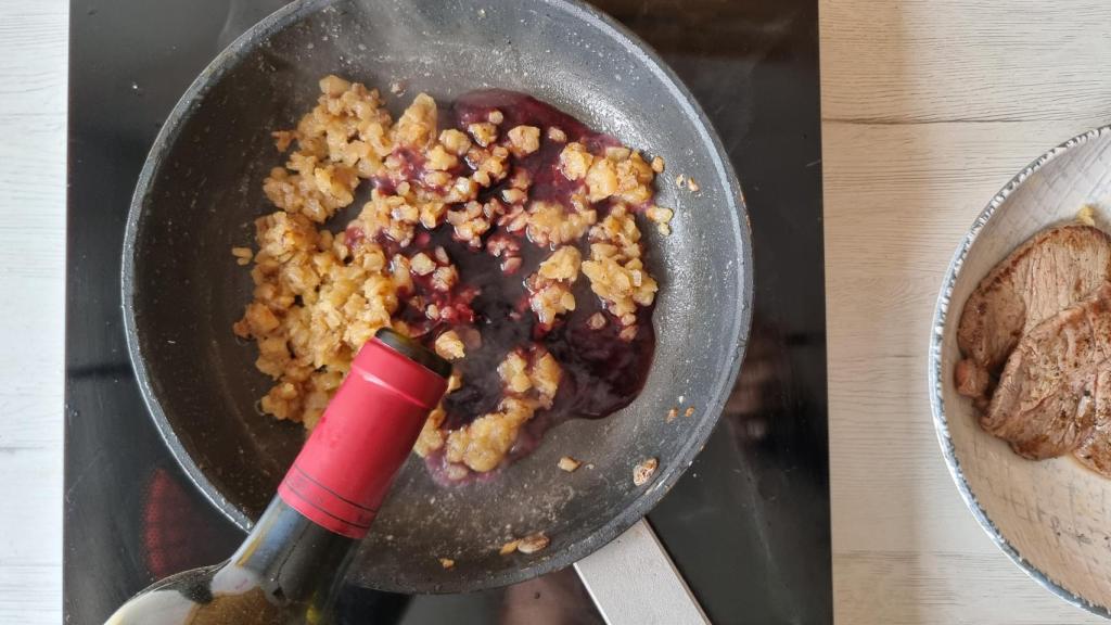 Incorporar entonces el vino tinto y dejar que evapore a fuego alegre, veremos cómo la harina hace su efecto y se empieza a endurecer todo. Añadir entonces el caldo caliente y remover constantemente hasta conseguir una salsa ligada.