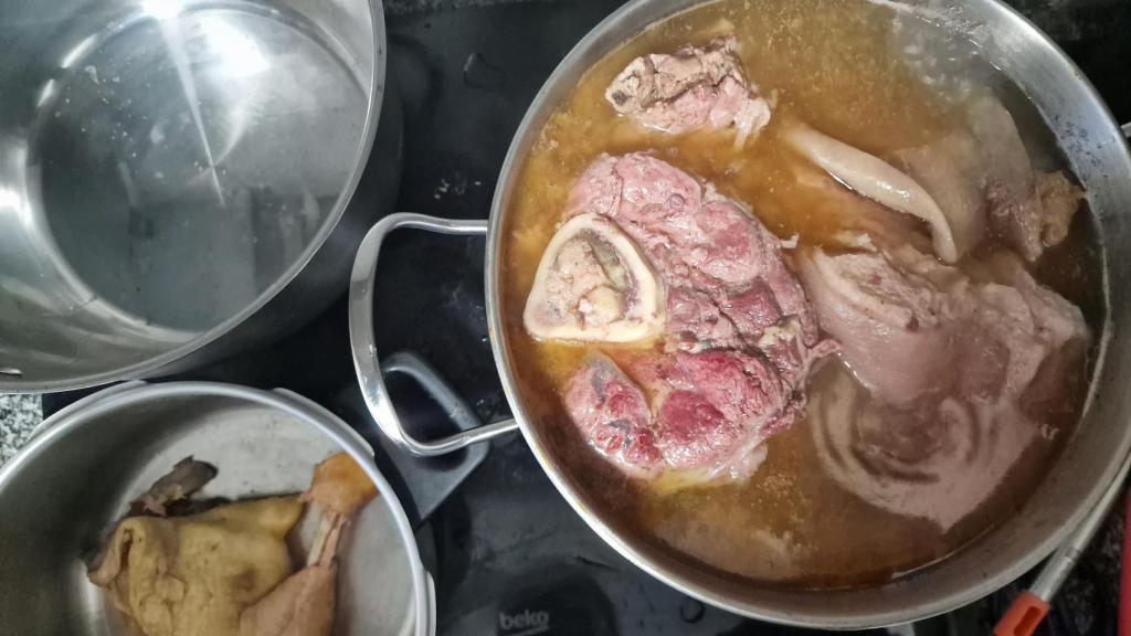 Vamos retirando las carnes de la olla a medida que estén cocidas y las reservamos en otra olla. El pollo será lo primero en estar listo, pues no tardará mucho más de una hora.