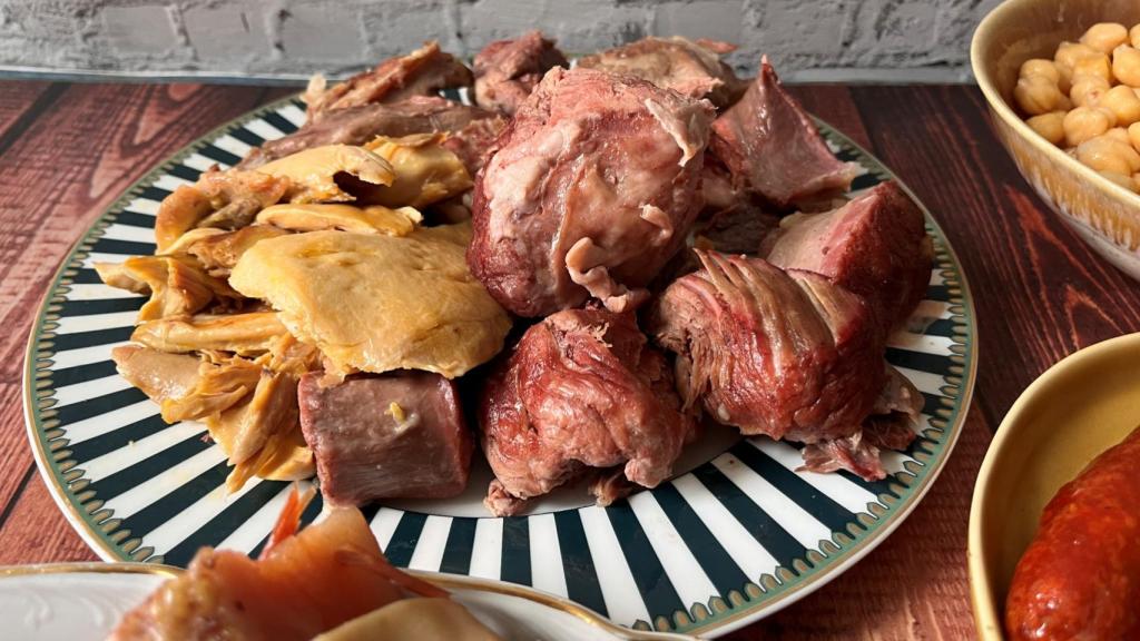 En otra fuente, las carnes frescas, el pollo y la ternera. No pasa nada si se sirven tal cual salen de la olla, en familia es lo normal, aunque para facilitar la tarea al comensal, es mejor servir las carnes troceadas y habiendo retirado los huesos que, si estas están bien cocidas, saldrán con suma facilidad.