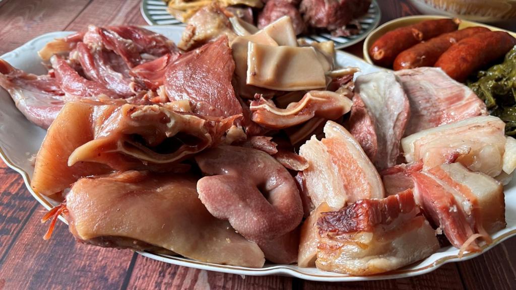 Finalmente, una fuente con las carnes de cerdo, el lacón, la oreja, la cabeza, el tocino y los trozos de panceta que se hayan usado.