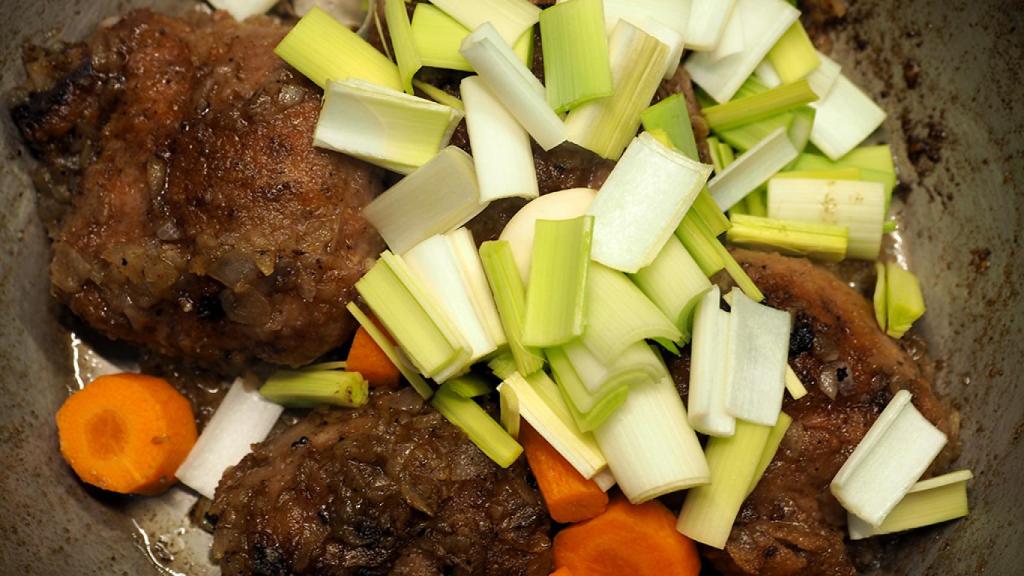 Añadimos la media cebolla bien picada, bajamos a fuego medio y removemos hasta que esté transparente. Añadimos el puerro picado, la zanahoria en rodajas de 1 centímetro, la cabeza de ajo entera pelada y removemos durante 5 minutos. Subimos el fuego al máximo, añadimos el vaso de vino blanco y dejamos reducir durante unos 5-10 minutos hasta que la salsa sea espesa.