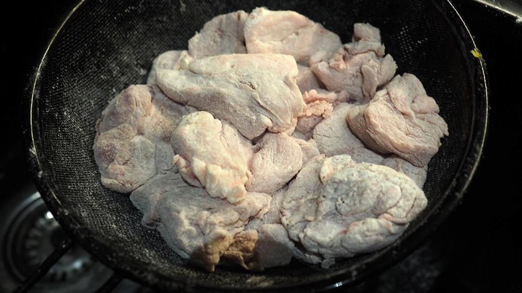 Una vez enharinado el cordero lo pasamos junto a los huesos a una sartén con aceite bien caliente y al fuego alto pasamos por todas las caras para sellarlo.