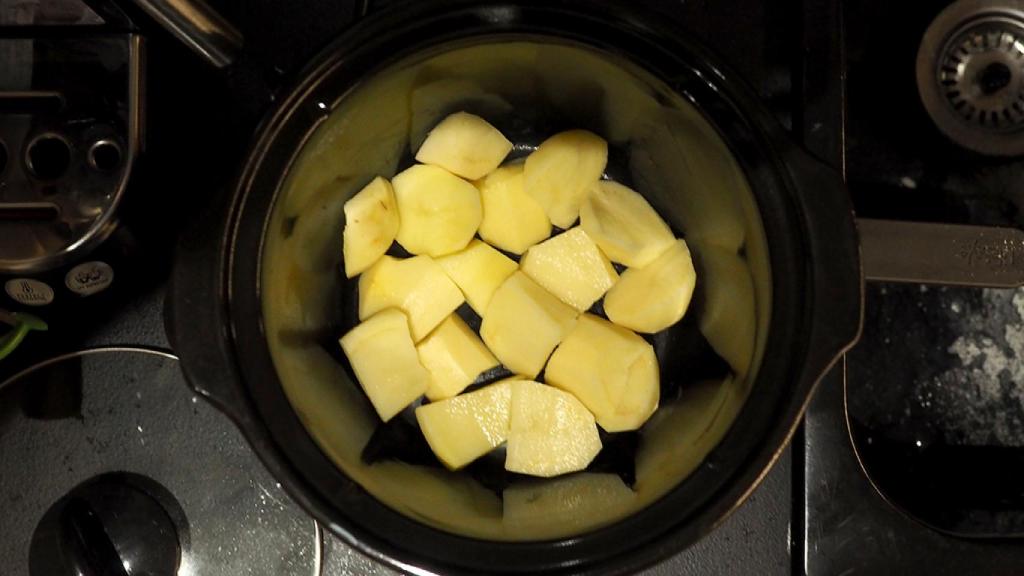 Pelamos las patatas y cortamos en trozos irregulares metiendo el cuchillo y arrancando para que suelte el almidón en la cocción. Ponemos los trozos de patata en la base de la Crock-pot.
