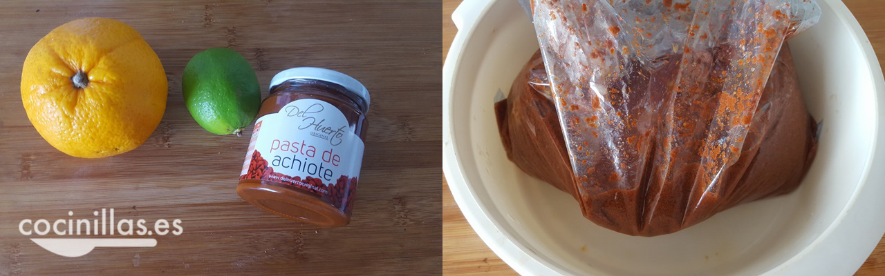 Ponemos en el vaso de la batidora todos los ingredientes del adobo y trituramos bien hasta tener una mezcla homogénea. Metemos la pechuga de pollo en una bolsa zip, echamos la mezcla de achiote, nos aseguramos de que la carne queda completamente cubierta, cerramos la bolsa y dejamos en la nevera de un día para otro y lo sacamos de la nevera una media hora antes de cocinarlo para que se atempere un poco, pero teniendo cuidado, sobre todo ahora en verano de no dejarlo en una encimera al sol directo.