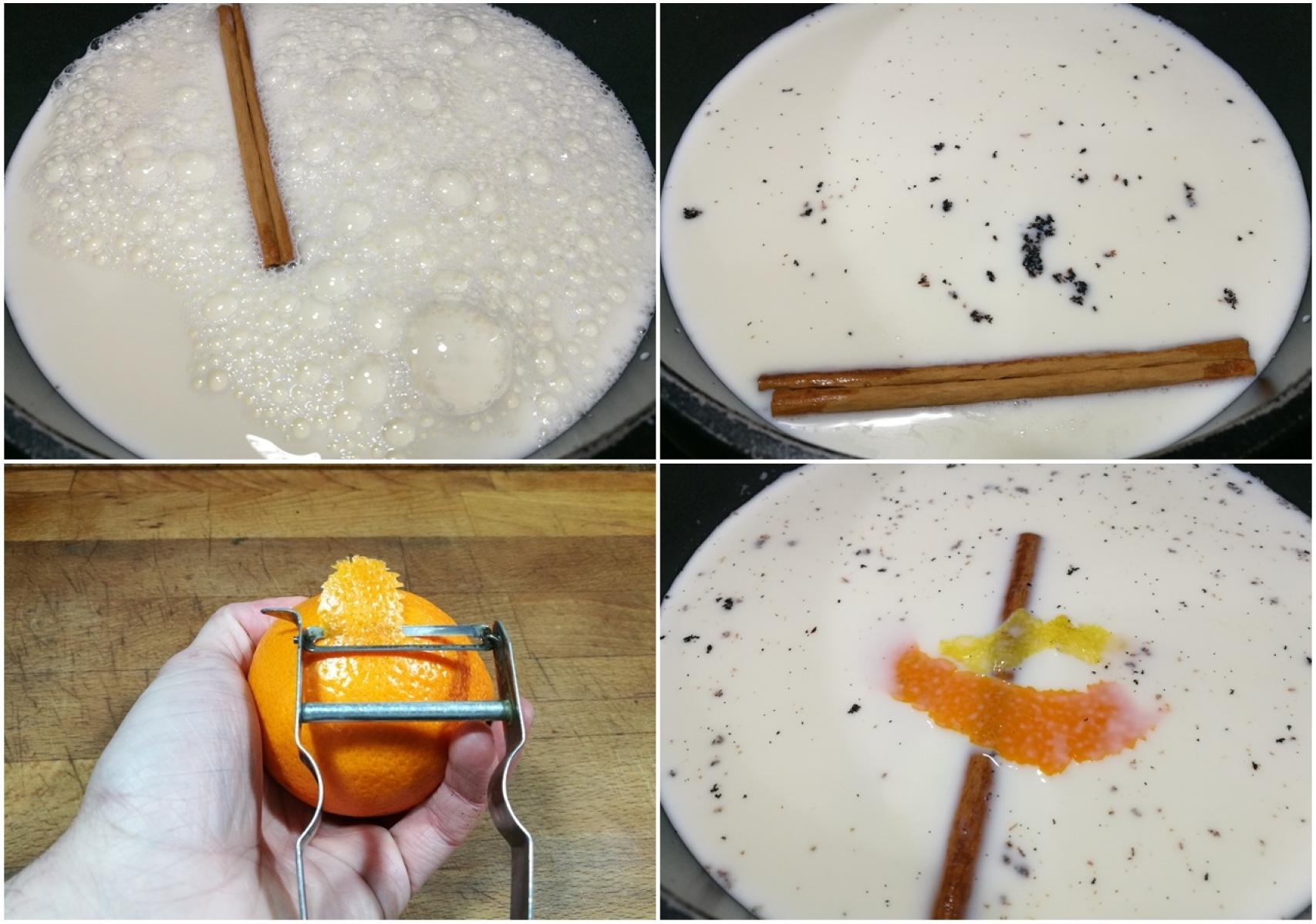 Una vez reducida la leche, introducimos las ramas de canela, la piel de los cítricos y la vaina de vainilla, así como los granos de su interior que previamente habremos rascado. Sacamos del fuego de inmediato, y dejamos que la leche se infusione unos 15 minutos con el calor residual de la leche en la misma olla.