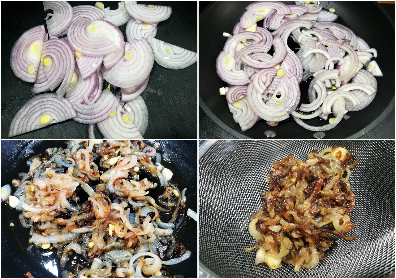 Una vez la cebolla esté bien acompotada y pochada, la sacamos del fuego y la posamos sobre un colador, para escurrirla del exceso de grasa.