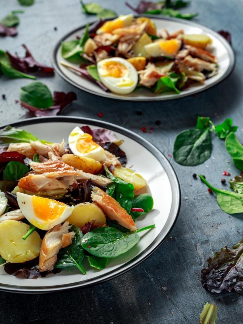 Convierte una humilde ensalada de patatas en un plato completo añadiendo alimentos ricos en proteínas como el huevo y las caballas ahumadas o en conserva.
