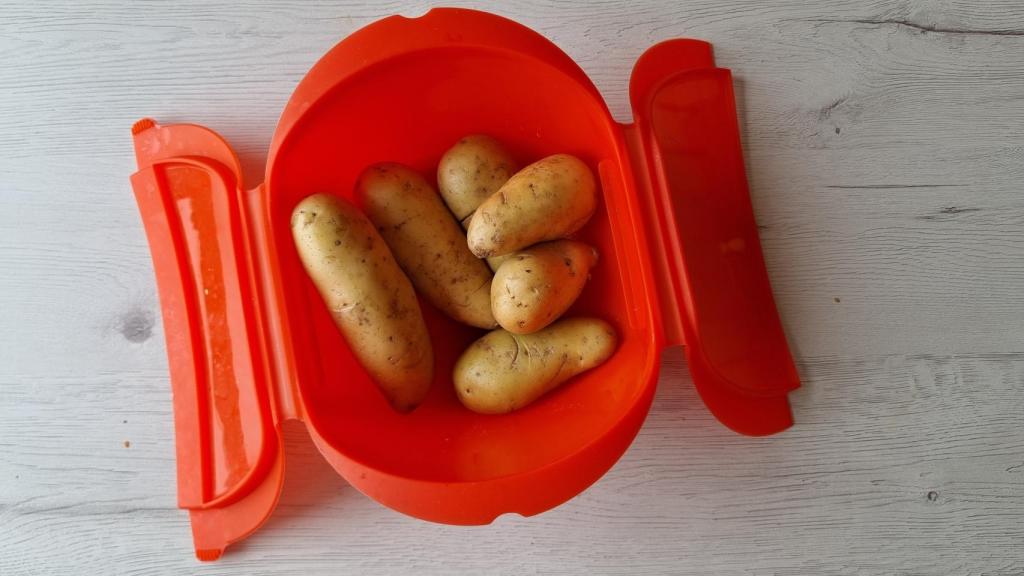 Fundamental será la selección de una patata de calidad, que quede cremosa y tenga un fondo dulce, y siempre se cocerá con la piel para que no absorba agua durante la cocción. Para ahorrarnos cazos se podrían cocer las patatas en el microondas, tanto en envases especiales para el cometido como en un simple bol con un poco de agua y bien tapado con papel de plástico para que se cocine en su propio vapor.
