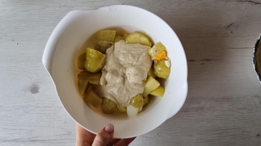 Mezclar los huevos con las patatas y agregar la salsa del condimento. Mezclar bien con cuidado para que las patatas no se rompan. Tiene que haber abundante mezcla para que queden bien bañadas. Si se quisiera, se podría añadir un poco de cebolla picada o cebollino. Terminar por encima con un poco más de dukkah y también con unas hojas de eneldo fresco.