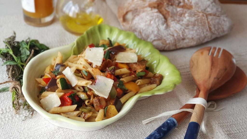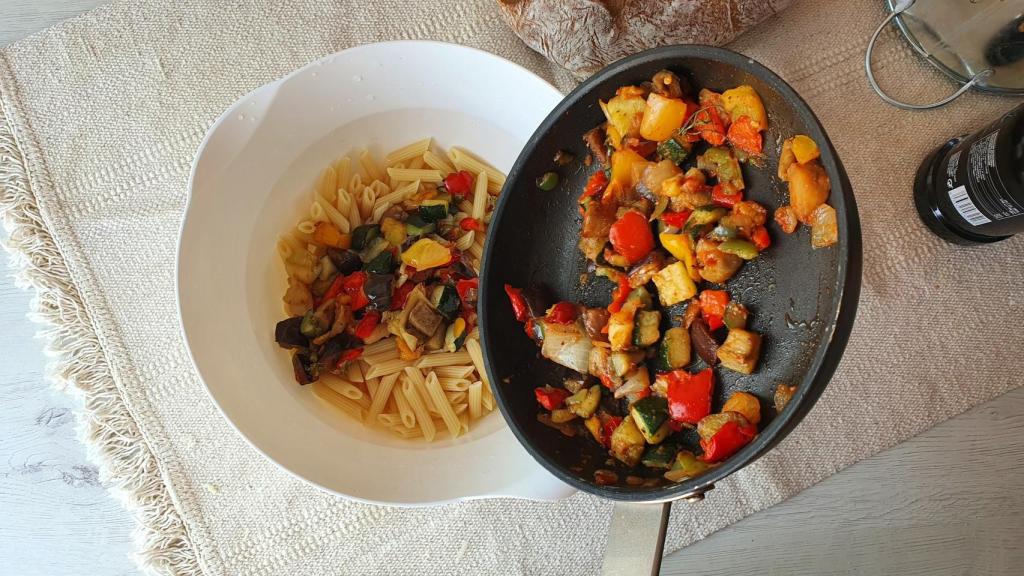 Si no hiciese demasiado calor, las verduras también se podrían preparar en el horno, asándolas como la clásica ratatouille francesa. Si se quisiera disfrutar caliente este plato también se podría, simplemente mezclando las verduras con la pasta caliente, quizás algo más de tomate, y gratinándolo todo en el horno.