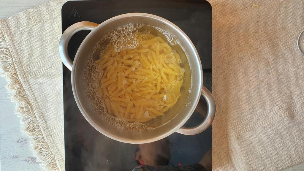 Cocer los macarrones en abundante agua con sal, echarlos siempre cuando el agua esté ya hirviendo y dejar cocinar el tiempo que mande el paquete a fuego medio-suave, que mantenga el hervor pero que no sea muy fuerte. Cuando pase el tiempo, escurrir bien y regar con abundante agua fría para que se enfríen rápidamente.