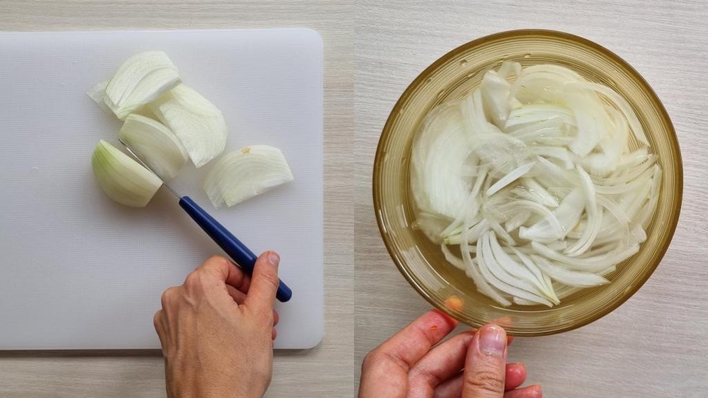 Pelar la cebolla y cortarla en juliana muy fina. Introducir en un bol con agua con hielo durante 20 minutos para que la cebolla pierda la fuerza y repita menos.
