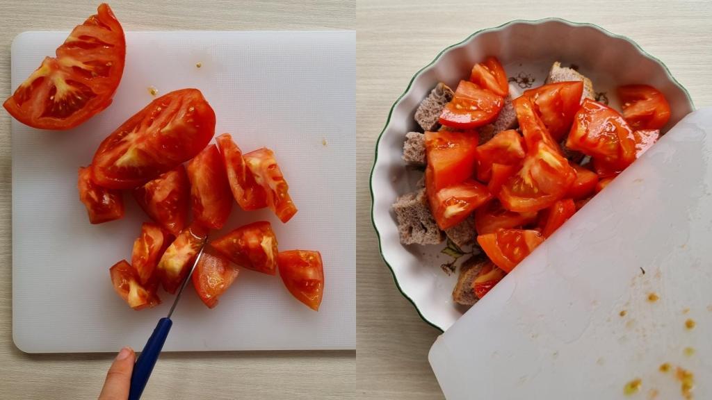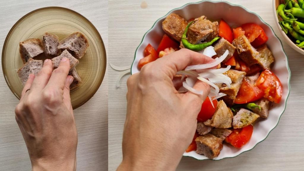 Existe un truco muy especial para esta ensalada que es agregar algo de tomate rallado a la preparación, para que el pan absorba un poco del jugo del tomate directamente. Por supuesto, hay que hacerla en el momento porque, de otra manera, el pan perdería ese crujiente característico que no se debe ocultar. Pero sí que debe reposar unos minutos para ablandarse lo justo y necesario, hay una magia detrás de ese punto perfecto.