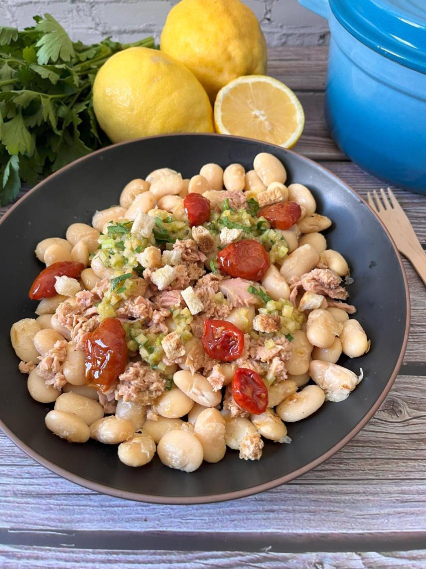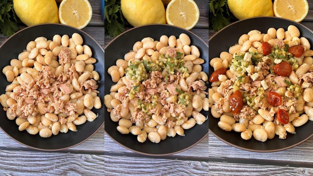Ponemos las alubias en una fuente, echamos por encima el atún desmigado y regamos con el aliño. Para terminar, ponemos unos tomates cherry semisecos en aceite de oliva y algunos croutons que darán un toque crujiente.