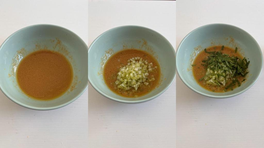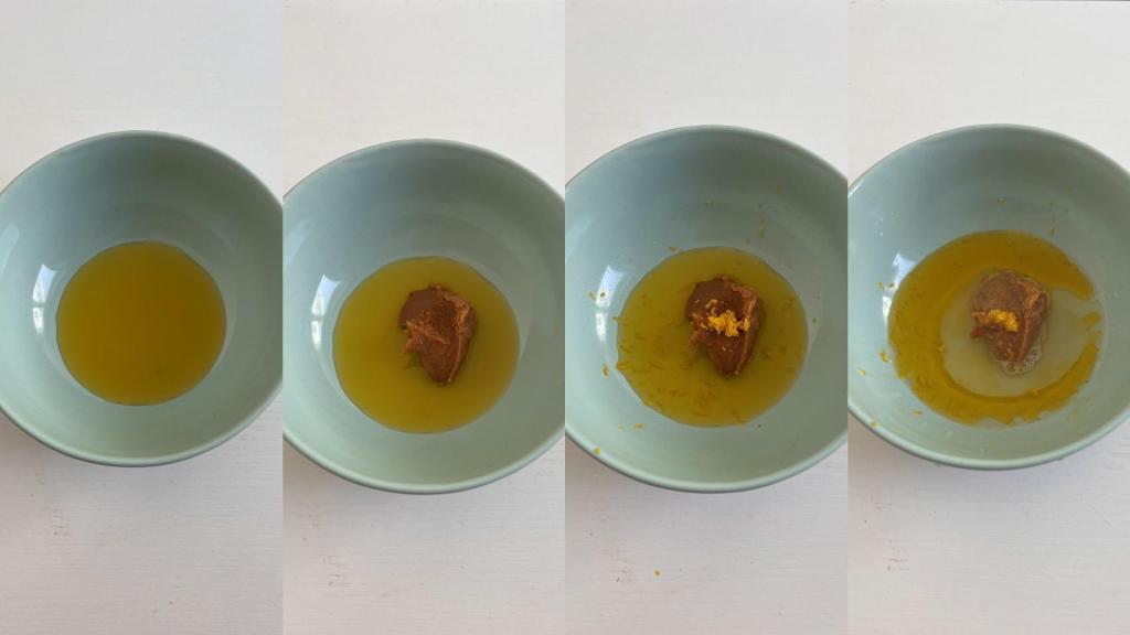 En un cuenco pequeño ponemos dos cucharadas de aceite de oliva virgen extra, una cucharadita de pasta de miso y la ralladura y el zumo de medio limón. Batimos bien con un tenedor o con un batidor de varillas hasta emulsionar la mezcla.