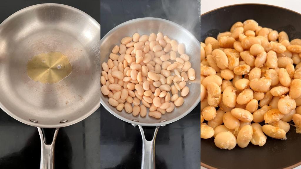 Enjuagamos las alubias y las escurrimos bien. Ponemos a calentar una cucharada de aceite de oliva virgen extra y, cuando esté caliente, echamos las alubias. Las cocinamos a fuego medio-alto meneando la sartén de vez en cuando hasta que veamos que empiezan a coger color.