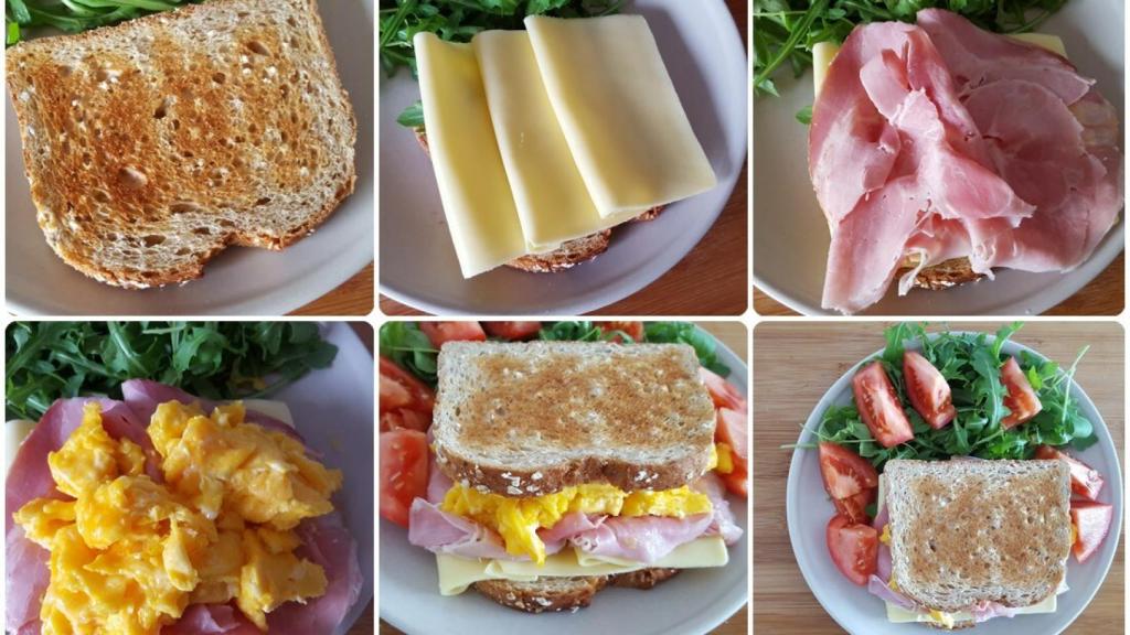 Tostamos las rebanadas de pan -yo lo he hecho en la tostadora e inmediatamente montamos el sándwich colocando una capa de queso sobre el pan caliente, el pavo o el jamón y los huevos revueltos encima con sal al gusto, tapamos el sándwich y servimos inmediatamente.