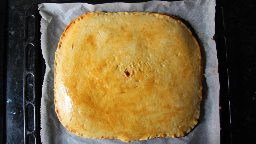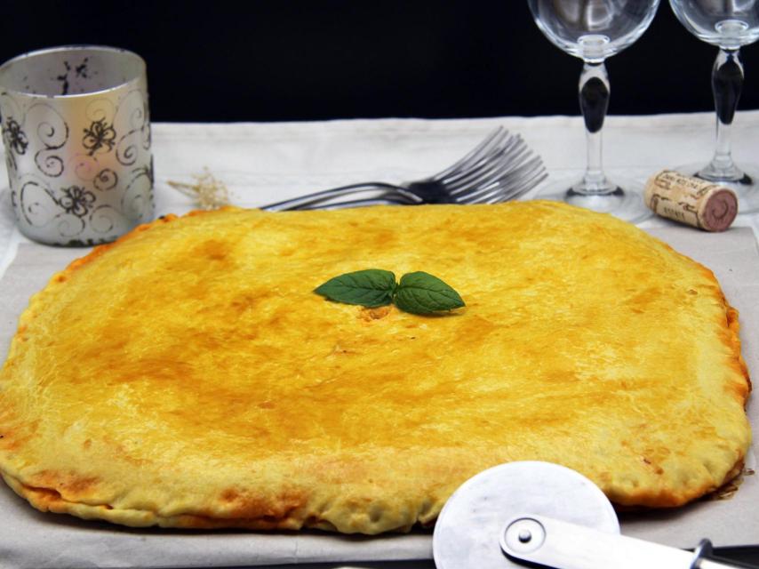 Con el rodillo extendemos la segunda mitad de la masa y cubrimos la base de la empanada. Recortamos si nos queda masa sobrante y sellamos los bordes. Si nos quedan recortes los podemos amasar de nuevo y hacer algún adorno para poner sobre la empanada, quedará más vistosa.