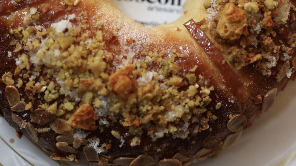La diferencia con otros roscones es que la mayor parte del agente levante es masa madre de panettone, llevando unas 7 horas de fermentación final tras haber pasado 24 horas de fermentación en bloque anteriormente. Acabado con almendra fileteada, granillo, azúcar humedecido, tiras de naranja confitada, crumble de pistacho y honeycomb.