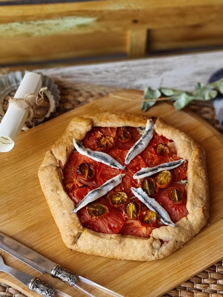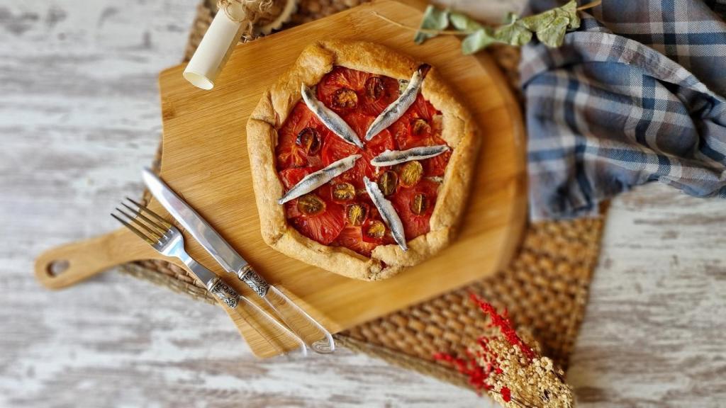 Tarta de tomate y boquerones, receta de galette francesa hecha con espelta