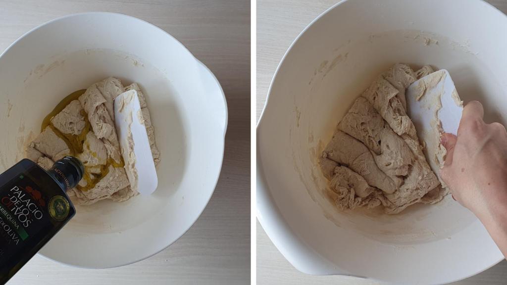 En un bol, disponer la harina y hacer un hueco en el centro de esta, como un volcán. Ahí, añadir el agua, el aceite y la levadura y mezclar todo bien poco a poco, añadiendo cada vez un poco más de harina. Está bien ayudarse con una espátula de panadería. Lo ideal es utilizar agua a temperatura ambiente si el ambiente es templado, si está demasiado fría se retardará la fermentación. No puede estar tampoco muy caliente.