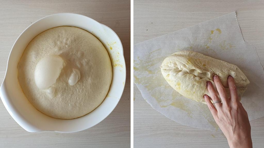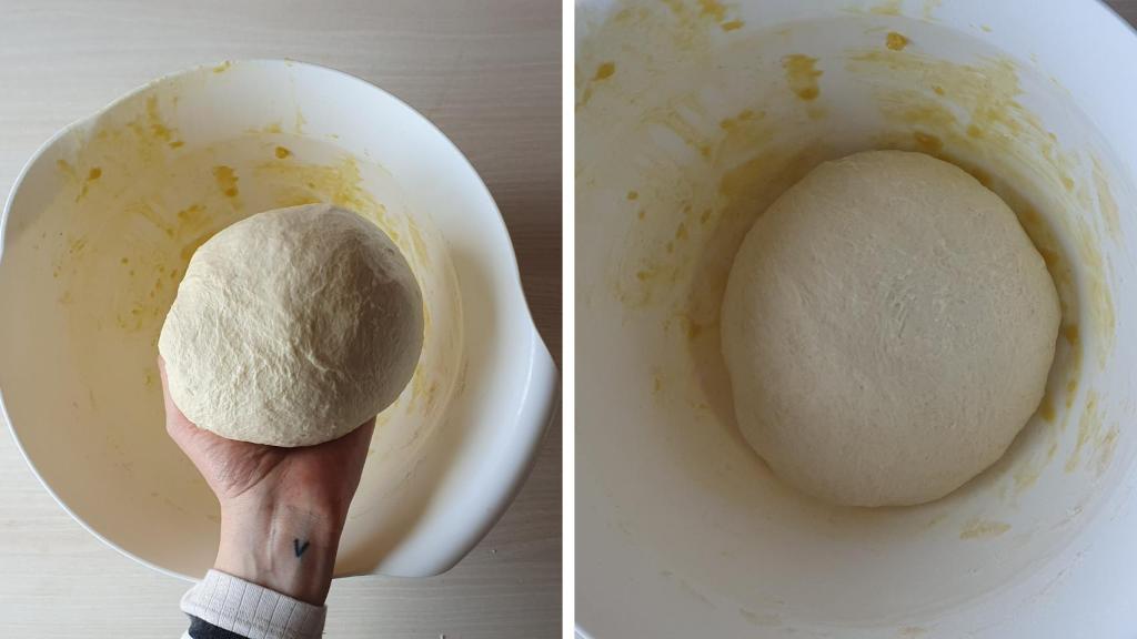 Hacer una bola y dejar fermentar la masa en un bol aceitado previamente. Tapar con un film por encima y dejar fermentar en un lugar templado fuera de corrientes de aire. Tendrá que doblar el volumen, el tiempo dependerá del calor que haga en casa. Cuanto más calor, más rápido es todo.