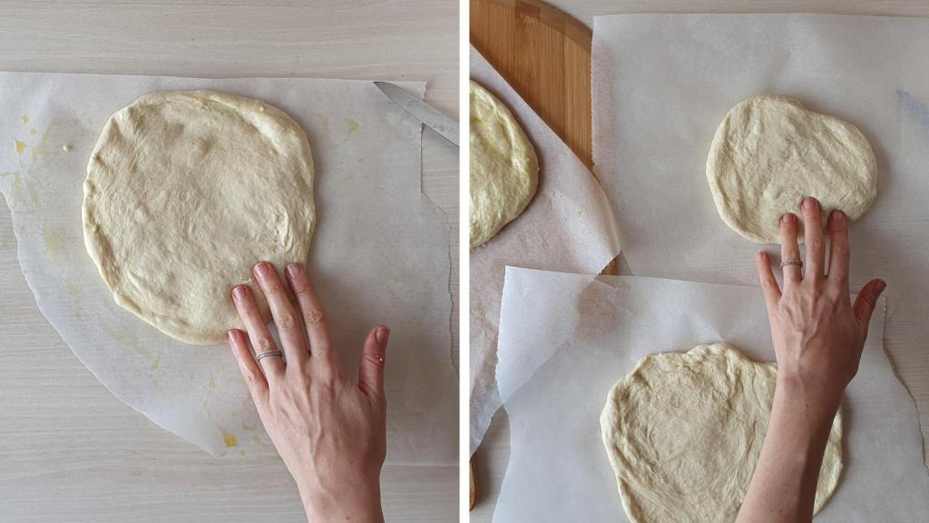 Cuando ya haya doblado el volumen, desgasificar y volcar sobre una superficie aceitada o enharinada o un papel de hornear. Dividir la masa en tres piezas, o más si se quieren hacer tortas de aceite pequeñas, y hacer la forma de las tortas aplanando con las manos. Añadir un poco de aceite, tapar con papel film a contacto y dejar fermentar de nuevo durante 1 hora o el tiempo necesario para que casi doble el volumen.