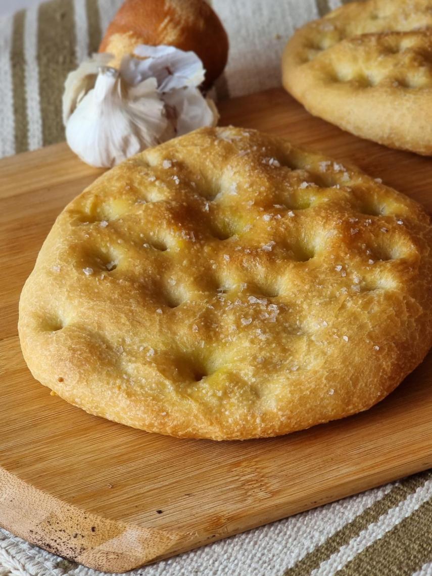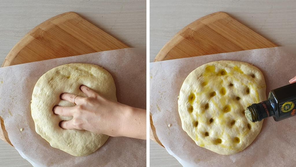 Calentar el horno a 200 ºC y, cuando ya haya doblado el volumen, quitar el papel film, hacer unas hendiduras con los dedos en la masa y agregar una buena cantidad de aceite por encima. Añadir, si se quiere, también un poco de sal en escamas. Llevar al horno y cocinar durante unos 20 minutos aproximadamente o hasta que esté dorado. Lo ideal es deslizarlo a una bandeja que ya esté caliente en el horno o unas piedras refractarias. Dejar enfriar sobre una rejilla levemente cuando esté ya cocido antes de servir.