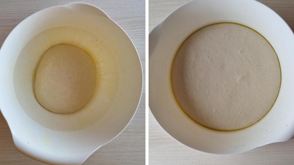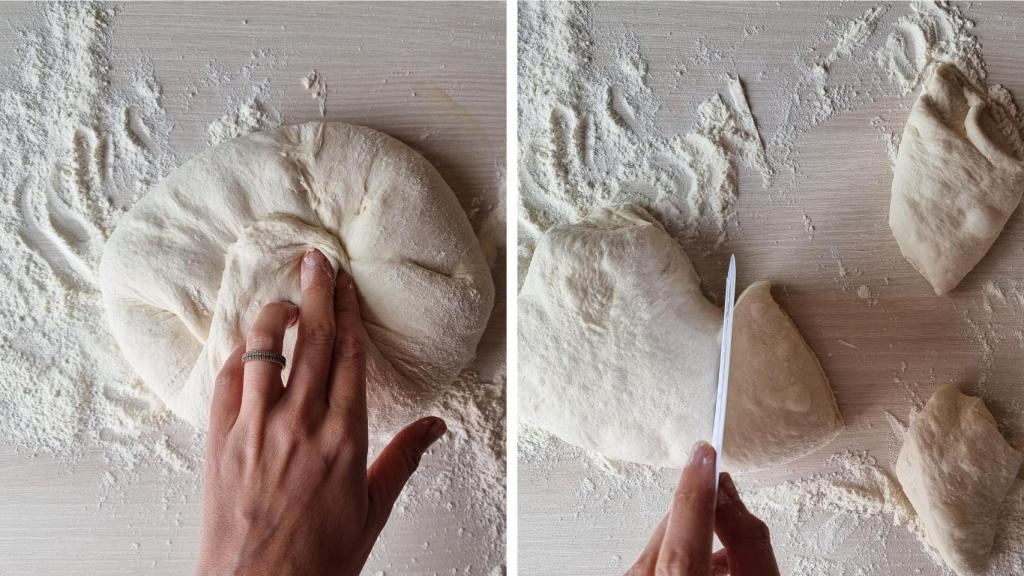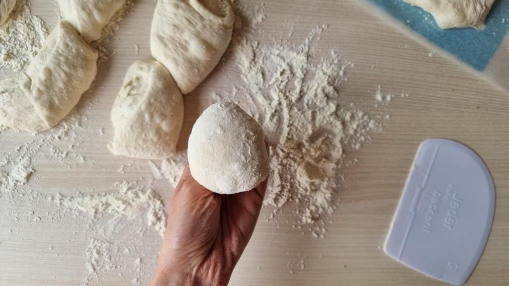 Cuando la masa haya doblado el volumen, volcarla sobre una superficie enharinada y espolvorear más harina por encima. Formar haciendo una bola lo mejor posible, con cuidado de no machacar demasiado el conjunto. Con la ayuda de un cuchillo o de una rasqueta de panadería cortar en porciones de unos 100 gramos.