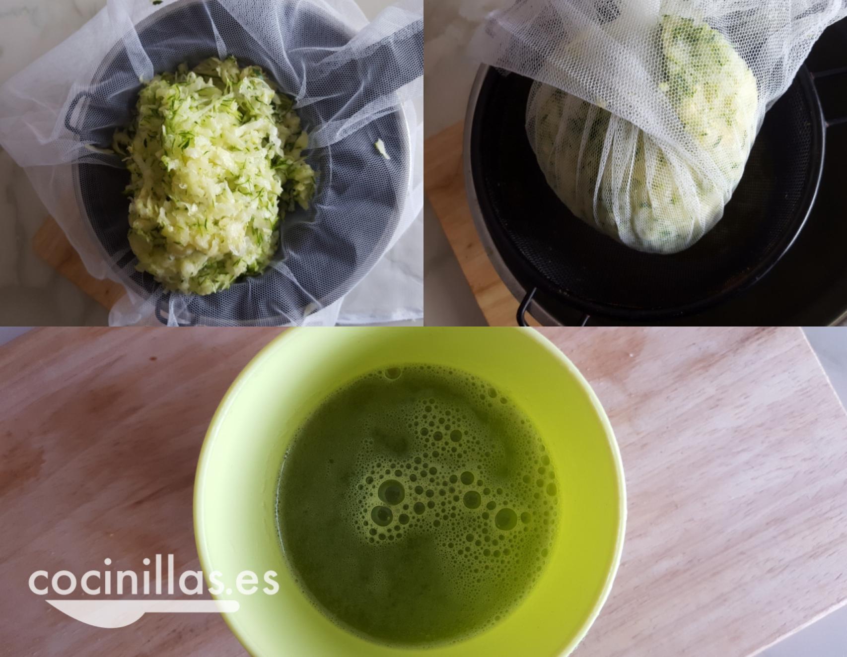 Ponemos un trozo de malla de nylon -un trapo limpio también nos valdría- sobre un colador y rallamos los calabacines. Envolvemos el calabacín rallado en la malla y estrujamos bien hasta que salga toda el agua de vegetación, que será bastante. Agua que reservaremos porque contiene un montón de vitaminas y podemos aprovecharla para un caldo de verduras o similar.