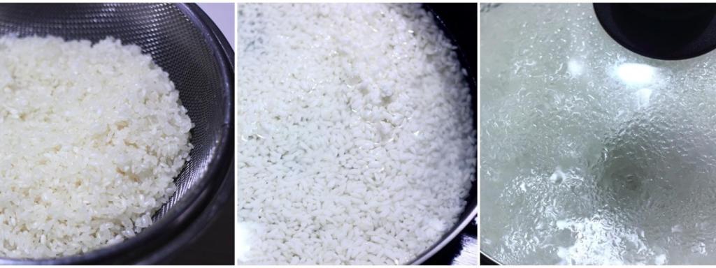 Ahora vamos a cocerlo, ponemos una cacerola que tenga tapa sobre el fuego apagado, echamos nuestro arroz bien lavado y escurrido y la misma medida de agua que hayamos usado para medir el arroz antes de lavarlo. Tapamos la olla y encendemos el fuego a tope (12/12), esperamos a que rompa a hervir (para la cantidad que yo suelo hacer tarda unos 3 minutos), si usamos una tapa de cristal lo sabremos fácilmente porque lo veremos, si no lo es tendremos que guiarnos por el oído, pero nunca abrir la olla.