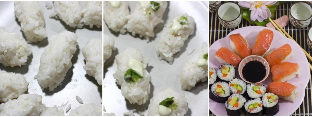 Para hacer los nigiris, nos mojamos de nuevo las manos -lo mejor es tener un cuenco con agua al lado porque necesitaremos mojárnoslas varias veces- y vamos formando “croquetas” de arroz, les ponemos un puntito de wasabi o mayonesa de wasabi -o las dos cosas- y encima un filetito de pescado que se quedará pegado gracias al wasabi. Y ya podremos disfrutar de nuestro sushi casero que serviremos con un cuenco de salsa de soja japonesa.