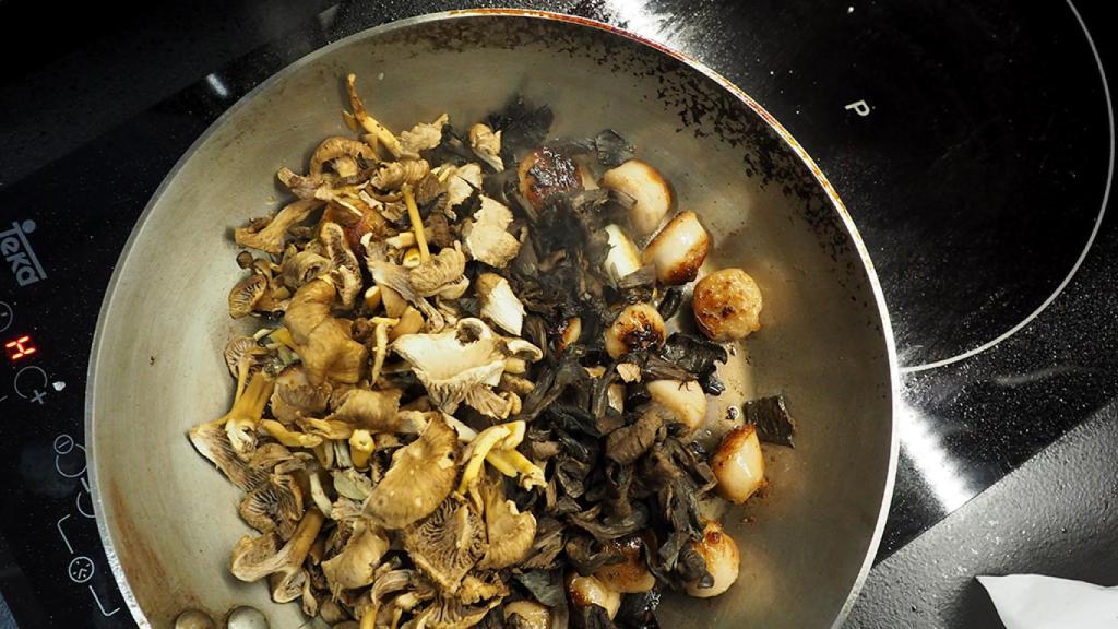 Puedes elegir casi cualquier tipo de seta, a mi me encanta la trompeta de la muerte, que en este caso he combinado con lengua de vaca (parecida al níscalo). Aquí tienes una parte importante y creativa de la receta, escoge las setas que más te gusten. Y si no sabes por dónde empezar, tira de trompeta de la muerte que está de vicio. Eso sí, intenta olvidarte de los champiñones laminados del supermercado, esos no saben a nada.