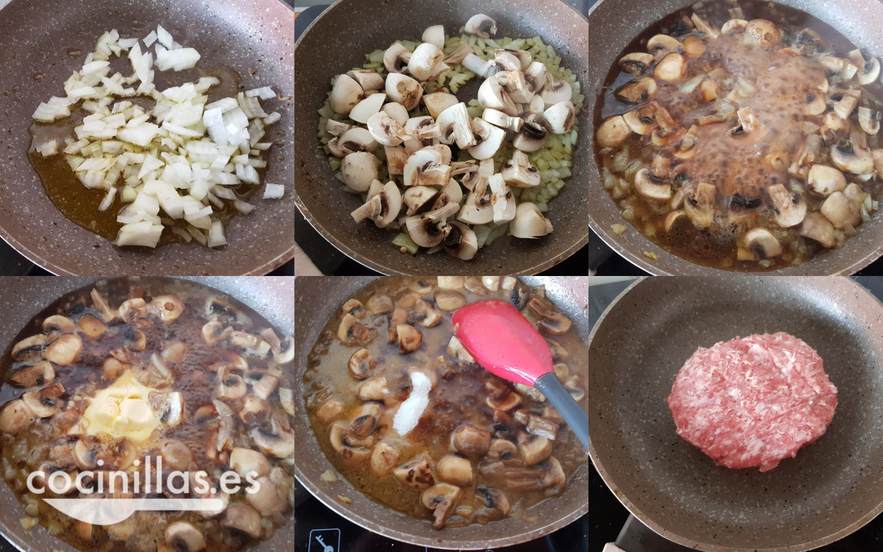 En una sartén ponemos a pochar la media cebolla junto con los champiñones y una pizca de sal hasta que esté tiernos. Añadimos el caldo de carne, llevamos a ebullición durante unos 4 o 5 minutos. Finalmente añadimos una cucharada de mantequilla y otra de harina. Mezclamos todo bien para que la harina se incorpore sin dejar grumo y dejamos cocinar durante un par de minutos a fuego medio bajo hasta que espese la salsa. Reservamos caliente.